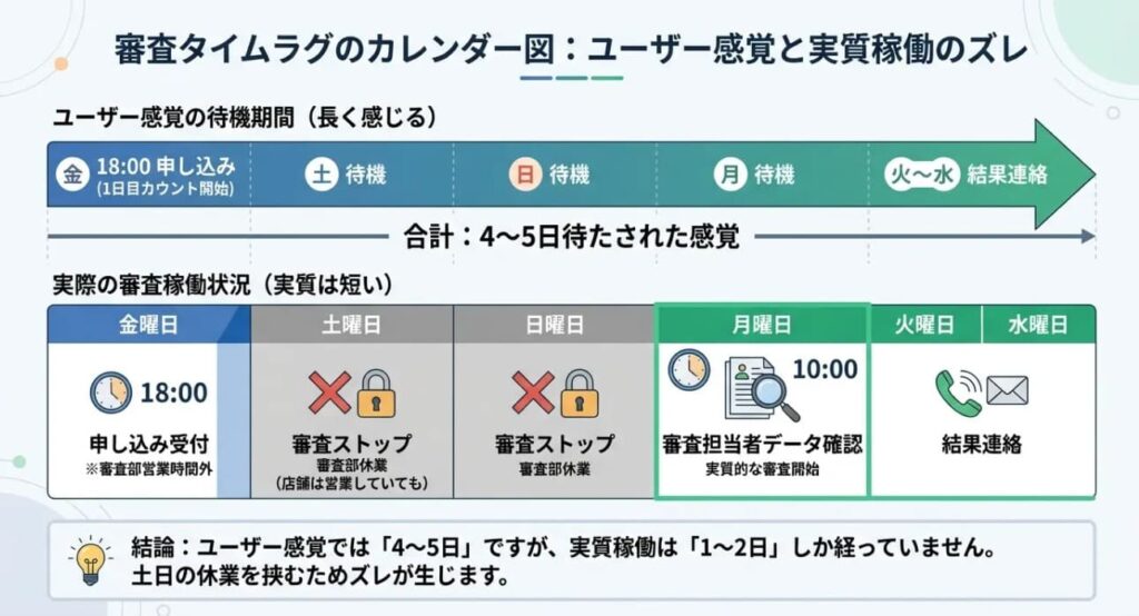土日祝は審査部が休みです。金曜申し込みなら、実質的な動き出しは月曜からです。