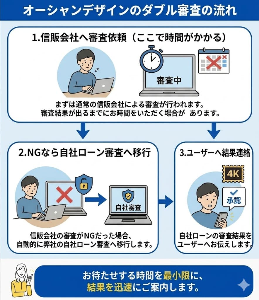まずは金利の安い通常ローンに通らないかを確認し、ダメだった場合に自社ローンの審査へと切り替わります。つまり、「信販会社からの回答待ち」が発生しているため、他社の自社ローン専門業者よりも初期レスポンスにタイムラグが生じやすいのです。