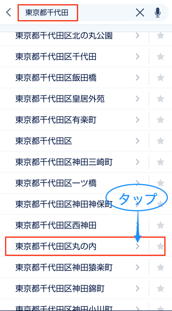 たとえば、検索欄に「東京都千代田区」と入力すれば、以下のように該当する地名がヒットします。