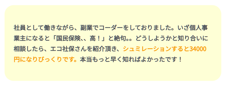 個人事業主になった方が、エコ社保で保険料を安くできたという声です。個人事業主は、国民健康保険に加入して保険料を支払いますが、その保険料は前年度の所得額に応じて決まります。所得が500万円や600万円になると、年間で60万円や70万円の負担となり、支払う金額が高いです。