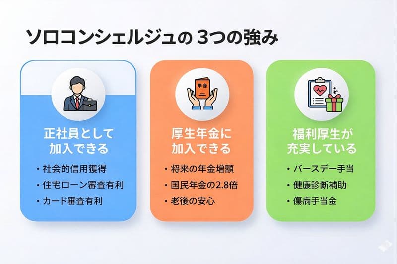 ソロコンシェルジュは、フリーランスや個人事業主が運営会社の従業員(正社員)として雇用されることで健康保険と厚生年金に加入できる社会保険料削減サービスです。