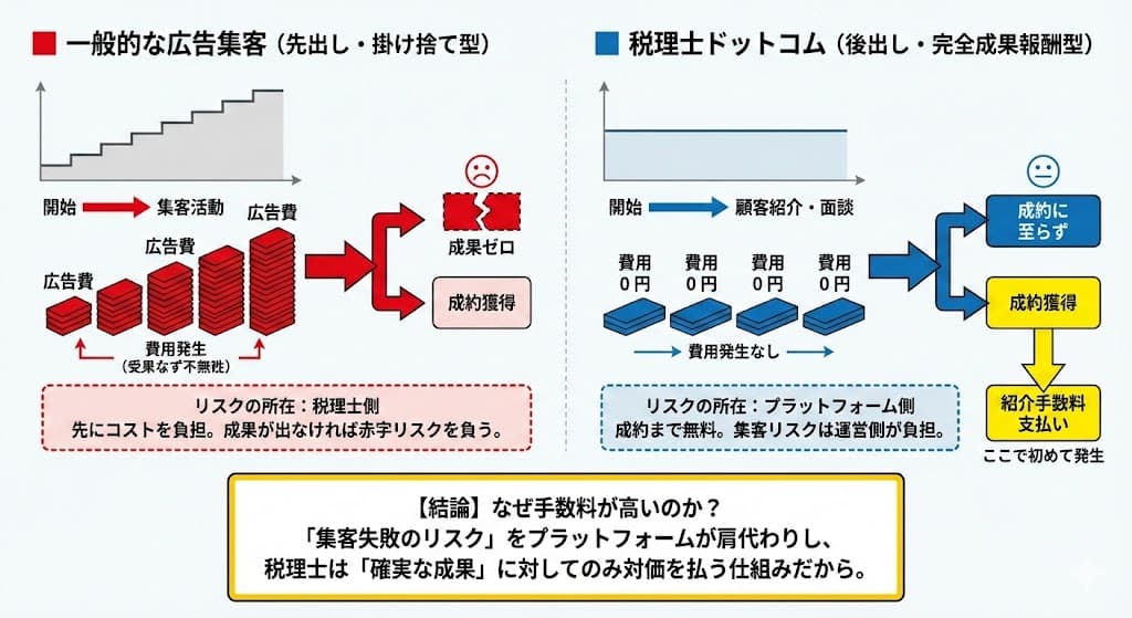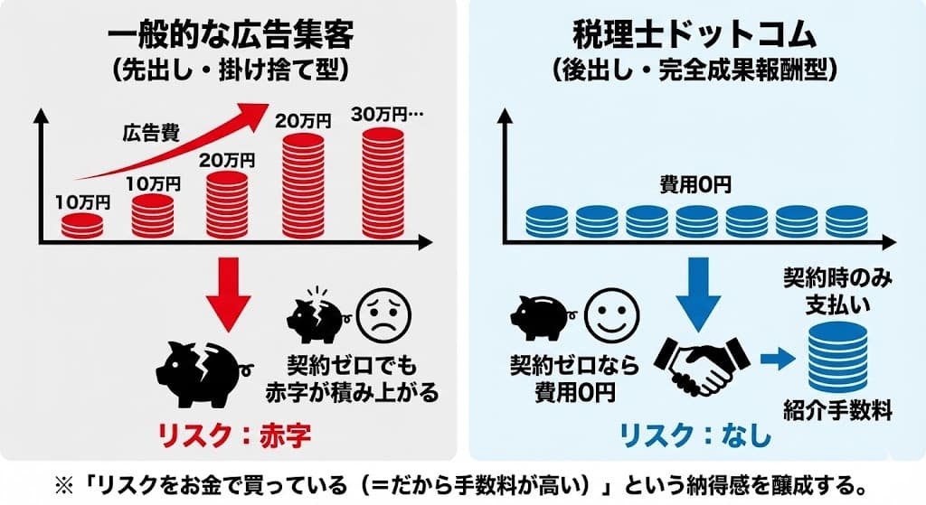 一般的なWeb広告(リスティング広告など)は、成果が出なくても広告費(クリック課金)が発生する「掛け捨て型」のリスクがあります。対して税理士ドットコムは、「売上が確定してから支払う(後出し)」仕組みであるため、集客における金銭的リスクを完全に排除できる点が強みです。