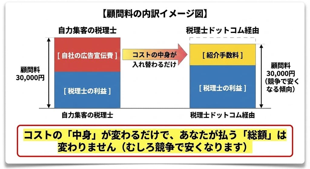 「営業コスト」はどの経路でも発生するため、特定の経路だけ顧問料が高くなるという理屈は成立しにくいのです。