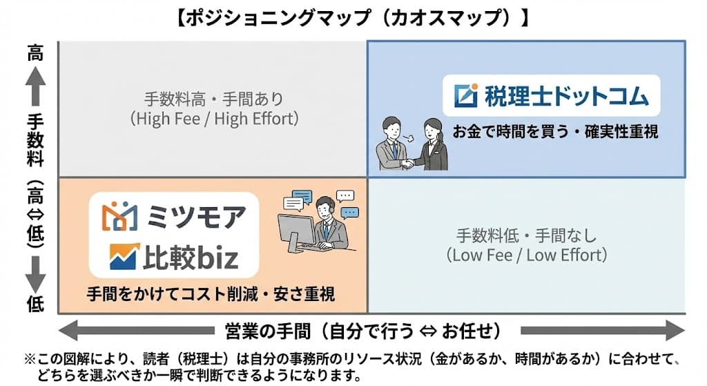 主要な3サービス(税理士ドットコム、ミツモア、比較biz)を、「コスト」「手間」「成約確度」の観点で比較しました。